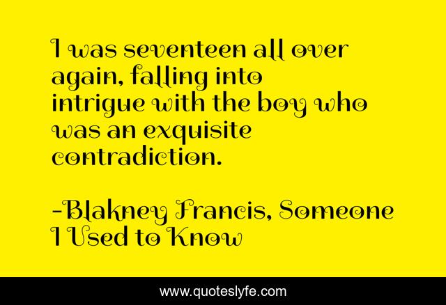 This page presents the quote "I was seventeen all over again, falling into intrigue with the boy who was an exquisite contradiction.". Author of this quote is Blakney Francis, Someone I Used to Know. This quote is about new-adult, ex-boyfriend, love, soul-mates, first-love, teenagers, past, romance, ex-girlfriend,.