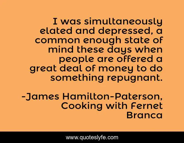 This page presents the quote "I was simultaneously elated and depressed, a common enough state of mind these days when people are offered a great deal of money to do something repugnant.". Author of this quote is James Hamilton-Paterson, Cooking with Fernet Branca. .