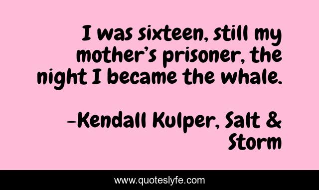 This page presents the quote "I was sixteen, still my mother’s prisoner, the night I became the whale.". Author of this quote is Kendall Kulper, Salt & Storm. This quote is about prisoner, whale, ocean,.