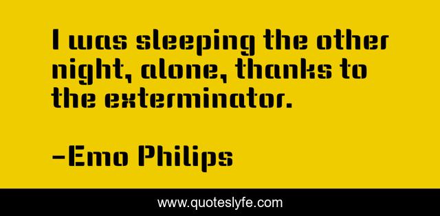 This page presents the quote "I was sleeping the other night, alone, thanks to the exterminator.". Author of this quote is Emo Philips. This quote is about alone, thanks, night,.