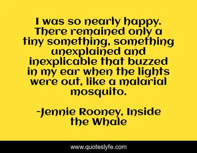 This page presents the quote "I was so nearly happy. There remained only a tiny something, something unexplained and inexplicable that buzzed in my ear when the lights were out, like a malarial mosquito.". Author of this quote is Jennie Rooney, Inside the Whale. .