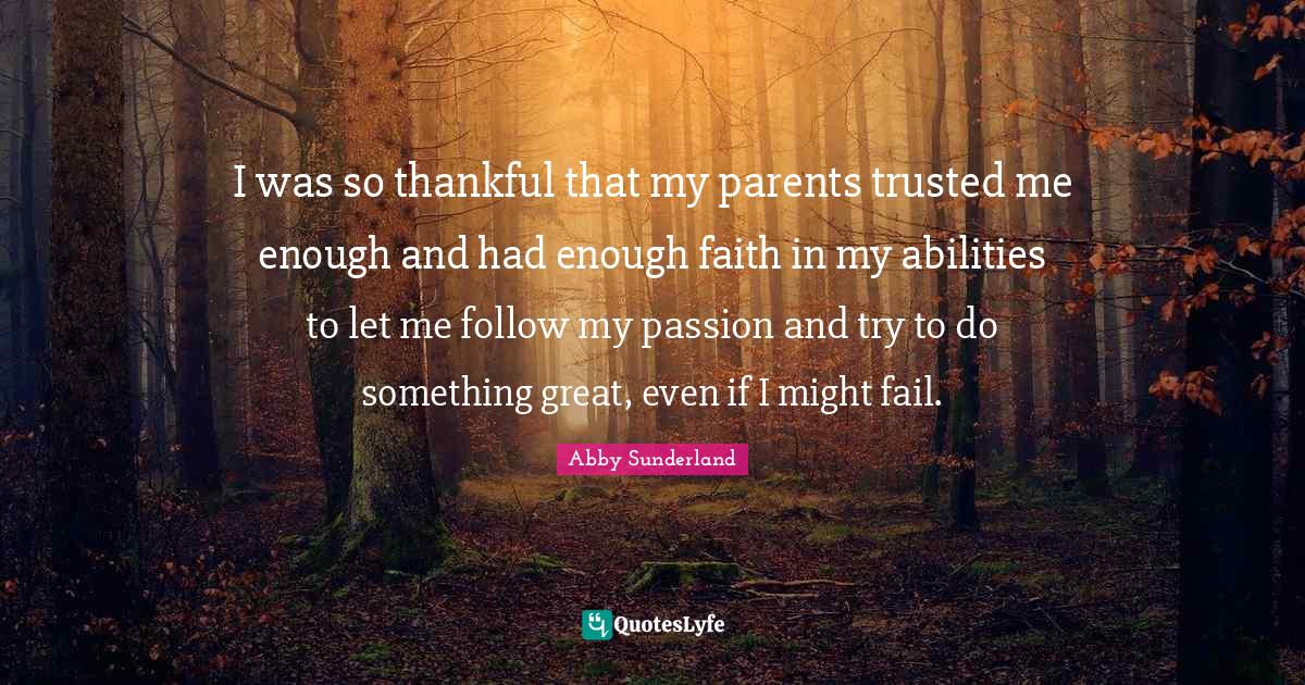 This page presents the quote "I was so thankful that my parents trusted me enough and had enough faith in my abilities to let me follow my passion and try to do something great, even if I might fail.". Author of this quote is Abby Sunderland. This quote is about my passion, passion, had enough, let me, enough, thankful, parent, trying, might,.