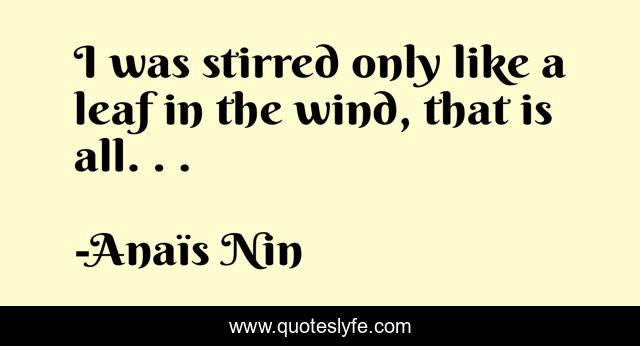 This page presents the quote "I was stirred only like a leaf in the wind, that is all. . .". Author of this quote is Anaïs Nin. This quote is about enthusiasm, erotic-romance, romantic, inspirational,.