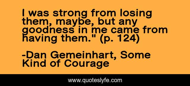 This page presents the quote "I was strong from losing them, maybe, but any goodness in me came from having them." (p. 124)". Author of this quote is Dan Gemeinhart, Some Kind of Courage. This quote is about enthusiasm, family, inspirational,.