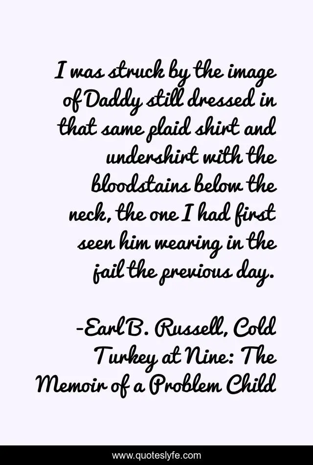 This page presents the quote "I was struck by the image of Daddy still dressed in that same plaid shirt and undershirt with the bloodstains below the neck, the one I had first seen him wearing in the jail the previous day.". Author of this quote is Earl B. Russell, Cold Turkey at Nine: The Memoir of a Problem Child. This quote is about humor, lifespan, crime, stories-life, family-saga, mental-illness,.