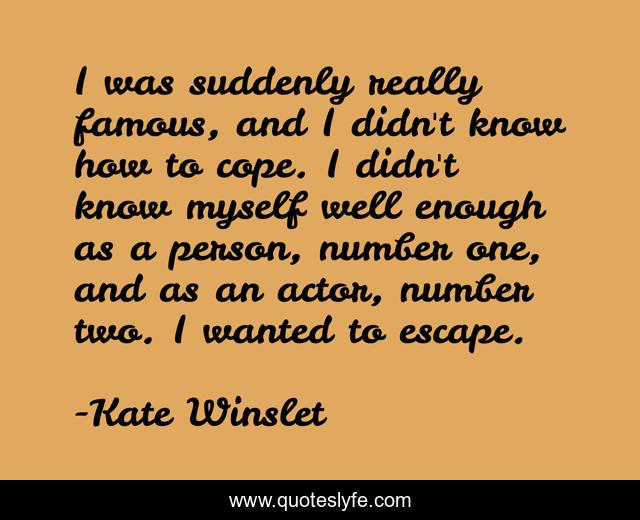 This page presents the quote "I was suddenly really famous, and I didn't know how to cope. I didn't know myself well enough as a person, number one, and as an actor, number two. I wanted to escape.". Author of this quote is Kate Winslet. This quote is about myself, escape,.