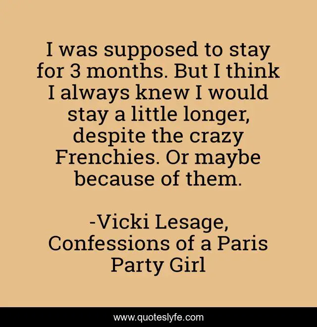 This page presents the quote "I was supposed to stay for 3 months. But I think I always knew I would stay a little longer, despite the crazy Frenchies. Or maybe because of them.". Author of this quote is Vicki Lesage, Confessions of a Paris Party Girl. This quote is about paris, french-people, travel, expats, parisians,.
