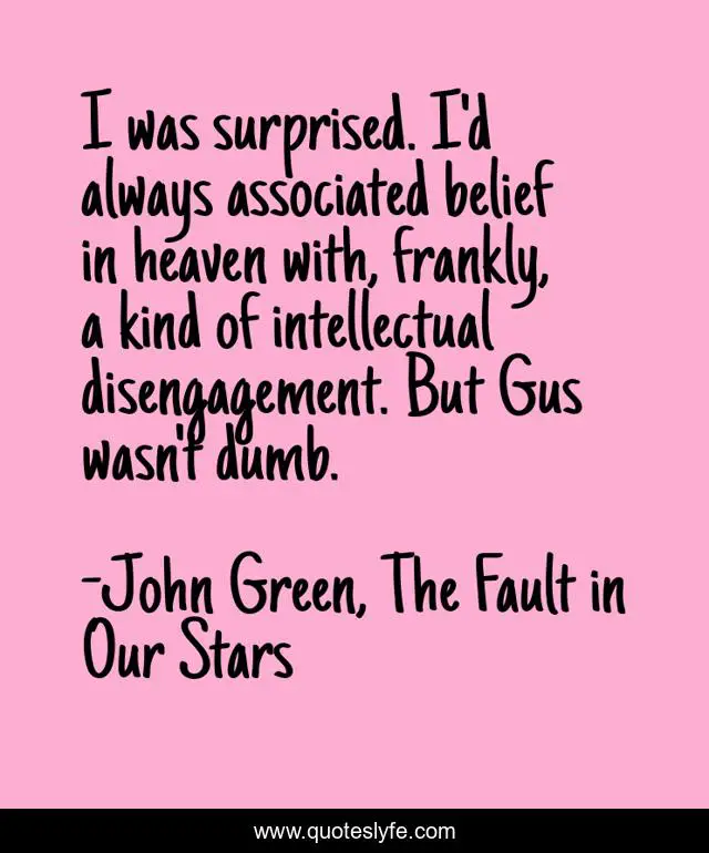 This page presents the quote "I was surprised. I'd always associated belief in heaven with, frankly, a kind of intellectual disengagement. But Gus wasn't dumb.". Author of this quote is John Green, The Fault in Our Stars. This quote is about faith, heaven, belief, god, religion, afterlife,.