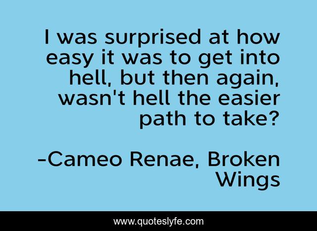 This page presents the quote "I was surprised at how easy it was to get into hell, but then again, wasn't hell the easier path to take?". Author of this quote is Cameo Renae, Broken Wings. .