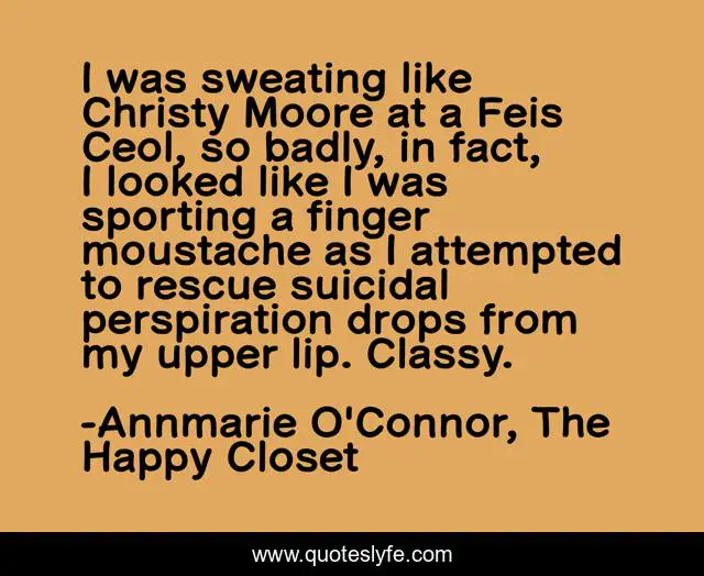 This page presents the quote "I was sweating like Christy Moore at a Feis Ceol, so badly, in fact, I looked like I was sporting a finger moustache as I attempted to rescue suicidal perspiration drops from my upper lip. Classy.". Author of this quote is Annmarie O'Connor, The Happy Closet. This quote is about style, fashion, humor, psychology, how-to-be-happy, inspirational, self-help, enthusiasm,.