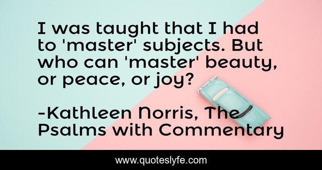 This page presents the quote "I was taught that I had to 'master' subjects. But who can 'master' beauty, or peace, or joy?". Author of this quote is Kathleen Norris, The Psalms with Commentary. This quote is about ineffable, education,.