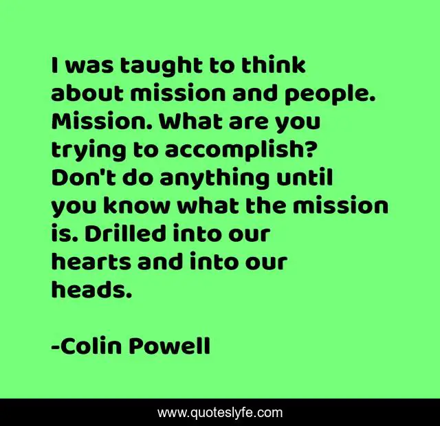 "Colin Powell Quotes." Quoteslyfe.com, 2025. Sat. 06 Dec. 2025. <https://www.quoteslyfe.com/quote/I-was-taught-to-think-about-mission-226165>.