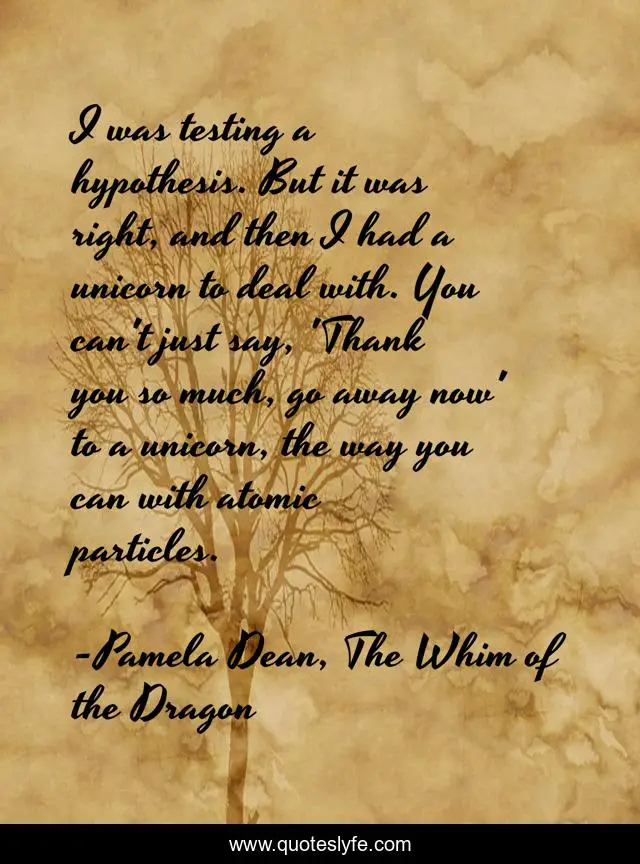 This page presents the quote "I was testing a hypothesis. But it was right, and then I had a unicorn to deal with. You can't just say, 'Thank you so much, go away now' to a unicorn, the way you can with atomic particles.". Author of this quote is Pamela Dean, The Whim of the Dragon. This quote is about science, scientific-method, unicorns, magic,.
