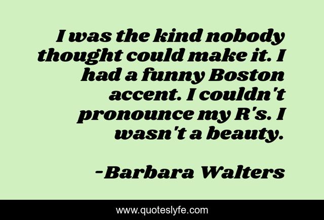 This page presents the quote "I was the kind nobody thought could make it. I had a funny Boston accent. I couldn't pronounce my R's. I wasn't a beauty.". Author of this quote is Barbara Walters. .