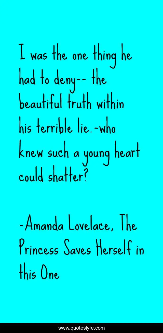 This page presents the quote "I was the one thing he had to deny-- the beautiful truth within his terrible lie.-who knew such a young heart could shatter?". Author of this quote is Amanda Lovelace, The Princess Saves Herself in this One. This quote is about heartache, disappointment,.