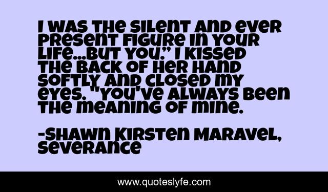 This page presents the quote "I was the silent and ever present figure in your life...but you.” I kissed the back of her hand softly and closed my eyes. "You've always been the meaning of mine.". Author of this quote is Shawn Kirsten Maravel, Severance. This quote is about romance, ya, love, affection, severance,.