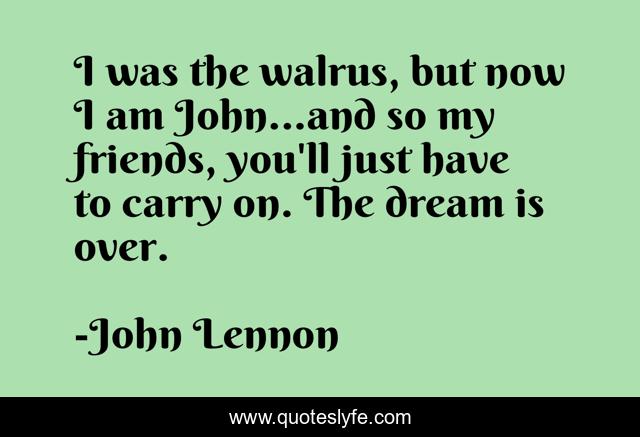 This page presents the quote "I was the walrus, but now I am John...and so my friends, you'll just have to carry on. The dream is over.". Author of this quote is John Lennon. This quote is about individuality, beatles, dream, walruses,.