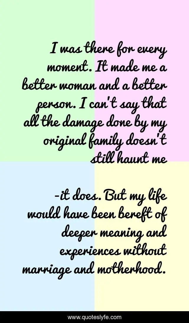 This page presents the quote "I was there for every moment. It made me a better woman and a better person. I can't say that all the damage done by my original family doesn't still haunt me". Author of this quote is it does. But my life would have been bereft of deeper meaning and experiences without marriage and motherhood.. .