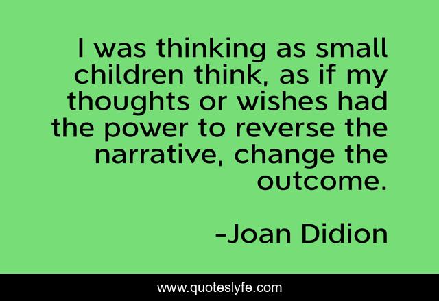 This page presents the quote "I was thinking as small children think, as if my thoughts or wishes had the power to reverse the narrative, change the outcome.". Author of this quote is Joan Didion. This quote is about power, children, thoughts, wishful-thinking,.