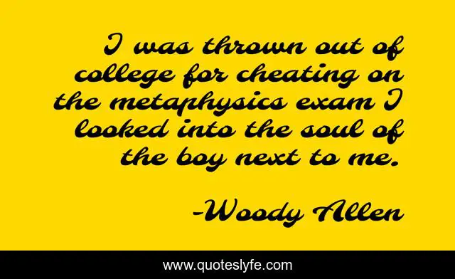 This page presents the quote "I was thrown out of college for cheating on the metaphysics exam I looked into the soul of the boy next to me.". Author of this quote is Woody Allen. .