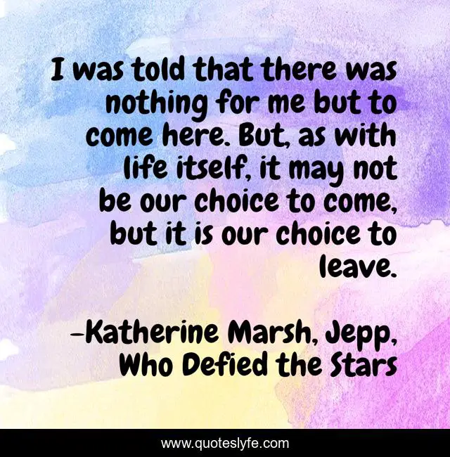This page presents the quote "I was told that there was nothing for me but to come here. But, as with life itself, it may not be our choice to come, but it is our choice to leave.". Author of this quote is Katherine Marsh, Jepp, Who Defied the Stars. This quote is about enthusiasm, life, fate, inspirational, choices,.