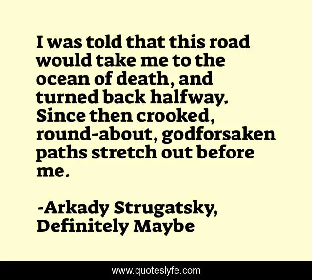 This page presents the quote "I was told that this road would take me to the ocean of death, and turned back halfway. Since then crooked, round-about, godforsaken paths stretch out before me.". Author of this quote is Arkady Strugatsky, Definitely Maybe. This quote is about definitely-maybe, choices,.