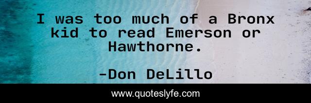 This page presents the quote "I was too much of a Bronx kid to read Emerson or Hawthorne.". Author of this quote is Don DeLillo. This quote is about ralph-waldo-emerson, literature, nathaniel-hawthorne, robert-mccrum, youth, bronx, reading,.