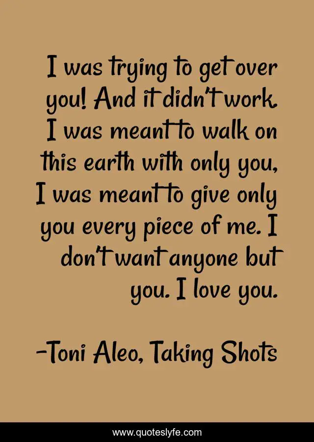 This page presents the quote "I was trying to get over you! And it didn’t work. I was meant to walk on this earth with only you, I was meant to give only you every piece of me. I don’t want anyone but you. I love you.". Author of this quote is Toni Aleo, Taking Shots. This quote is about romance, love, shea-alder, affection,.
