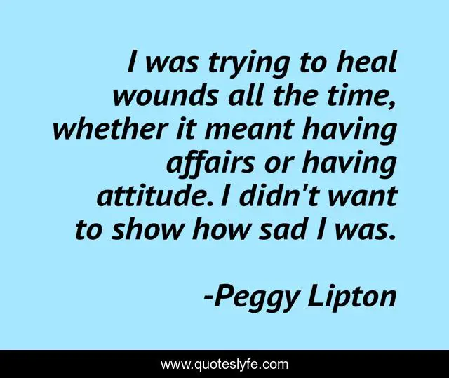 This page presents the quote "I was trying to heal wounds all the time, whether it meant having affairs or having attitude. I didn't want to show how sad I was.". Author of this quote is Peggy Lipton. This quote is about time, sad,.