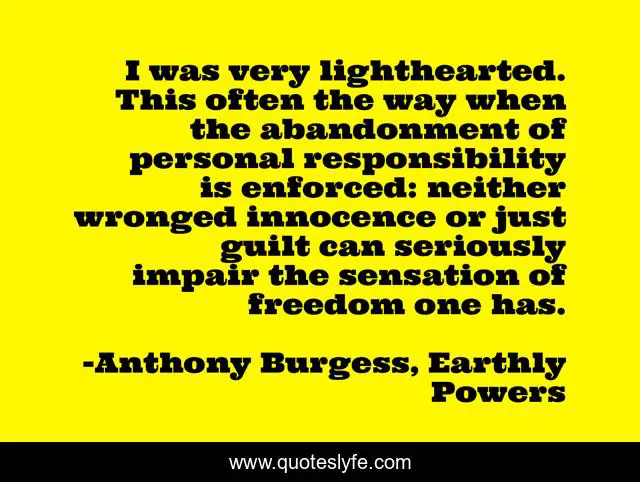 This page presents the quote "I was very lighthearted. This often the way when the abandonment of personal responsibility is enforced: neither wronged innocence or just guilt can seriously impair the sensation of freedom one has.". Author of this quote is Anthony Burgess, Earthly Powers. This quote is about persecution, innocence,.