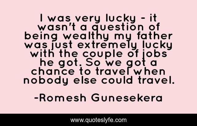 This page presents the quote "I was very lucky - it wasn't a question of being wealthy my father was just extremely lucky with the couple of jobs he got. So we got a chance to travel when nobody else could travel.". Author of this quote is Romesh Gunesekera. This quote is about travel, father, lucky,.