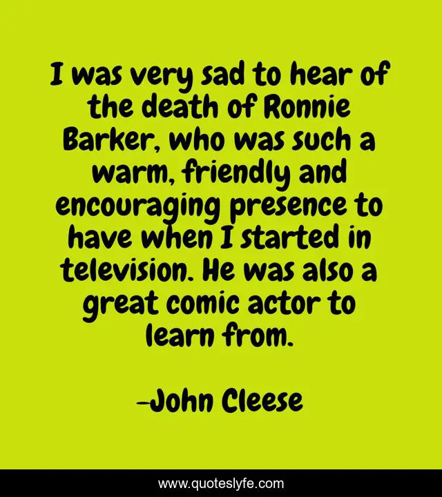 This page presents the quote "I was very sad to hear of the death of Ronnie Barker, who was such a warm, friendly and encouraging presence to have when I started in television. He was also a great comic actor to learn from.". Author of this quote is John Cleese. This quote is about great, death, television,.