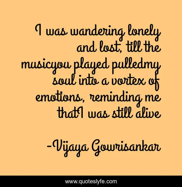 This page presents the quote "I was wandering lonely and lost, till the musicyou played pulledmy soul into a vortex of emotions, reminding me thatI was still alive". Author of this quote is Vijaya Gowrisankar. This quote is about pull, lonely, lost, soul, emotions, vortex, music, alive, wandering,.