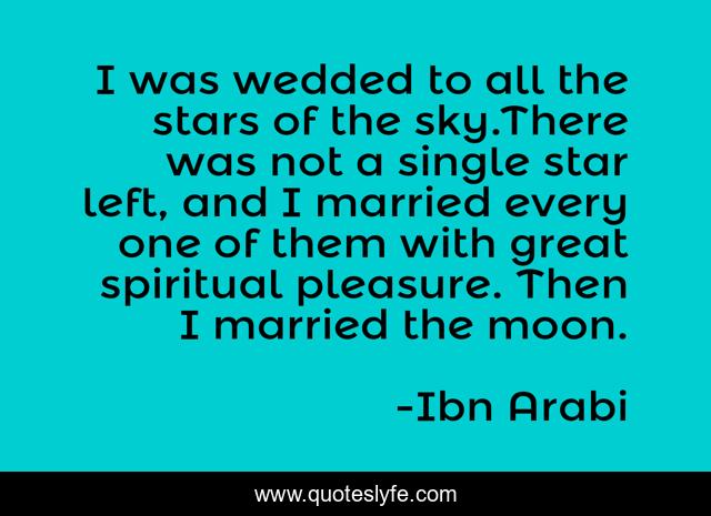 This page presents the quote "I was wedded to all the stars of the sky.There was not a single star left, and I married every one of them with great spiritual pleasure. Then I married the moon.". Author of this quote is Ibn Arabi. This quote is about mysticism, enlightenment, oneness-with-life, stars,.