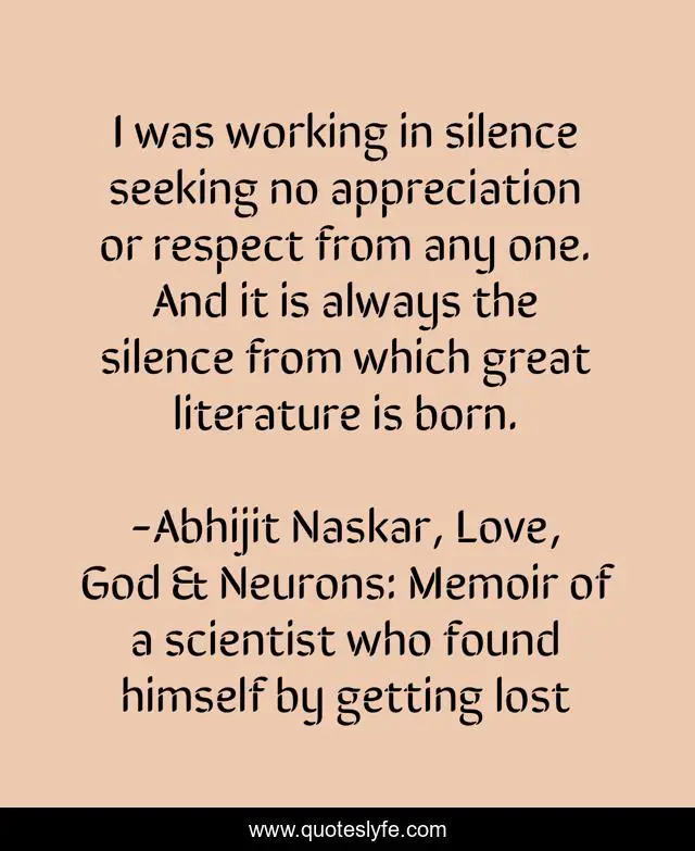 "Abhijit Naskar, Love, God & Neurons: Memoir of a scientist who found himself by getting lost Quotes." Quoteslyfe.com, 2025. Sat. 06 Dec. 2025. <https://www.quoteslyfe.com/quote/I-was-working-in-silence-seeking-no-111885>.