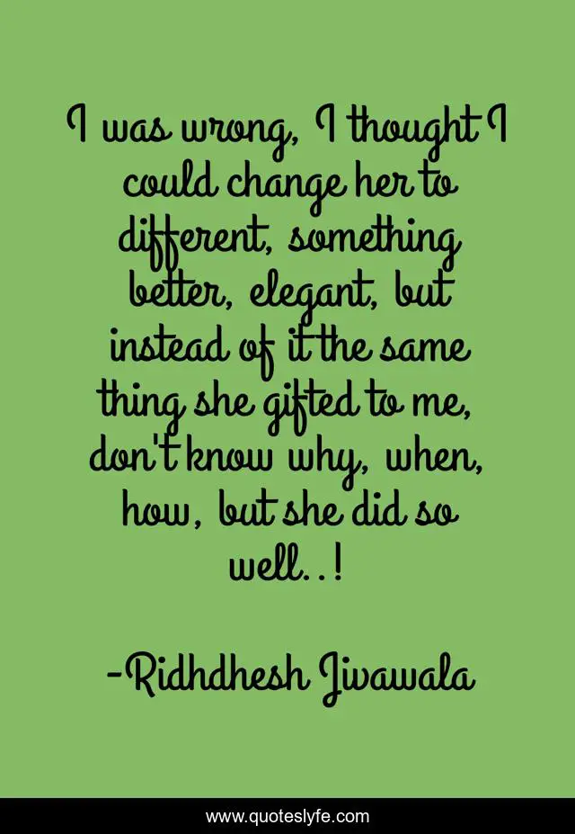 This page presents the quote "I was wrong, I thought I could change her to different, something better, elegant, but instead of it the same thing she gifted to me, don't know why, when, how, but she did so well..!". Author of this quote is Ridhdhesh Jivawala. This quote is about life, love, change, goodness, change-life, affection,.
