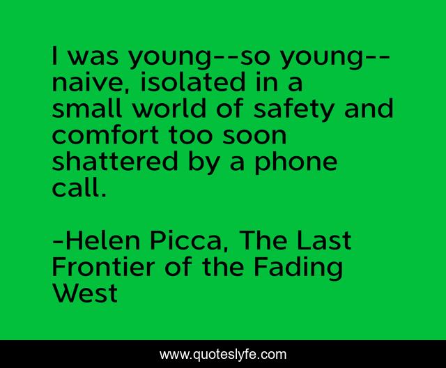 This page presents the quote "I was young--so young--naive, isolated in a small world of safety and comfort too soon shattered by a phone call.". Author of this quote is Helen Picca, The Last Frontier of the Fading West. This quote is about family-life, romantic, historical,.