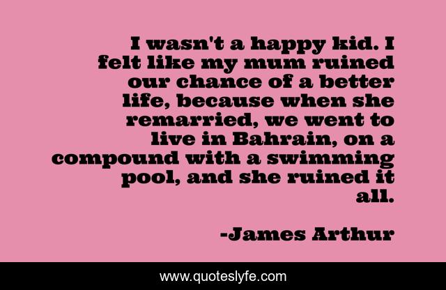 This page presents the quote "I wasn't a happy kid. I felt like my mum ruined our chance of a better life, because when she remarried, we went to live in Bahrain, on a compound with a swimming pool, and she ruined it all.". Author of this quote is James Arthur. This quote is about life, happy, swimming,.