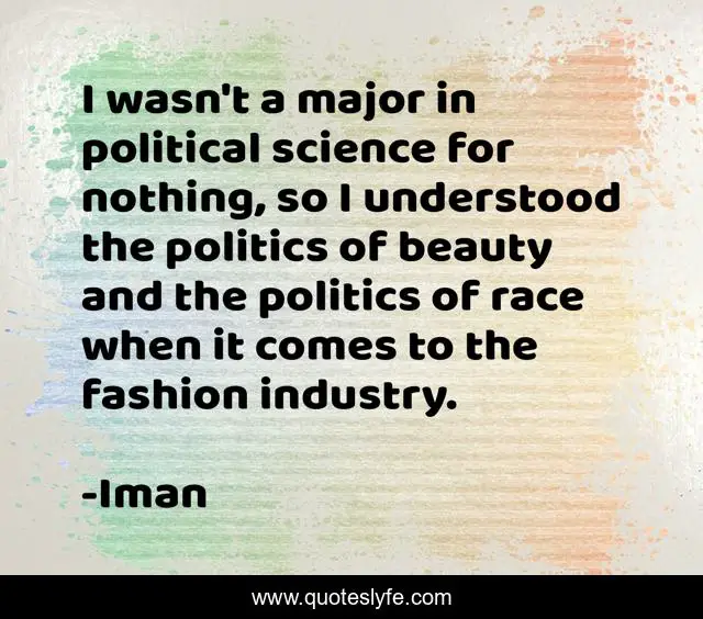 This page presents the quote "I wasn't a major in political science for nothing, so I understood the politics of beauty and the politics of race when it comes to the fashion industry.". Author of this quote is Iman. This quote is about politics, political, beauty,.