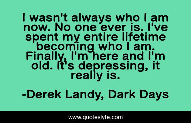 This page presents the quote "I wasn't always who I am now. No one ever is. I've spent my entire lifetime becoming who I am. Finally, I'm here and I'm old. It's depressing, it really is.". Author of this quote is Derek Landy, Dark Days. This quote is about derek-landy, skulduggery-pleasant, sad,.