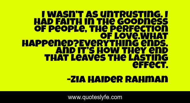 This page presents the quote "I wasn’t as untrusting. I had faith in the goodness of people, the perfection of love.What happened?Everything ends. And it’s how they end that leaves the lasting effect.". Author of this quote is Zia Haider Rahman. This quote is about faith, ends, love, perfection, goodness, affection,.