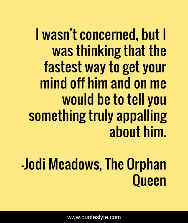 This page presents the quote "I wasn't concerned, but I was thinking that the fastest way to get your mind off him and on me would be to tell you something truly appalling about him.". Author of this quote is Jodi Meadows, The Orphan Queen. This quote is about flirty, cute, love, funny, flirting, comedy, friends, affection,.