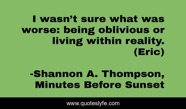 This page presents the quote "I wasn’t sure what was worse: being oblivious or living within reality. (Eric)". Author of this quote is Shannon A. Thompson, Minutes Before Sunset. This quote is about reality, uncertainty, fiction, lies, oblivious, questioning, young-adult, paranormal-romance, identity,.