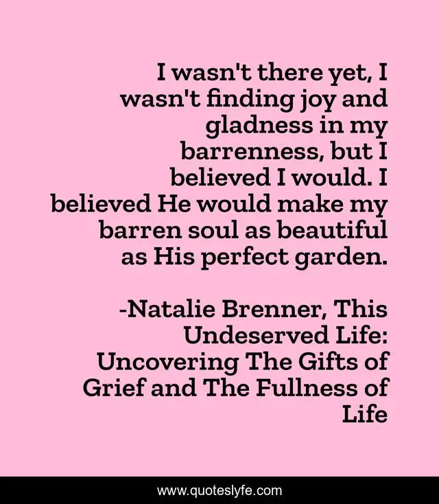 This page presents the quote "I wasn't there yet, I wasn't finding joy and gladness in my barrenness, but I believed I would. I believed He would make my barren soul as beautiful as His perfect garden.". Author of this quote is Natalie Brenner, This Undeserved Life: Uncovering The Gifts of Grief and The Fullness of Life. This quote is about beautiful, joy, joy-in-trials, christianity, barrenness, christian-living, beauty-from-ashes, trials,.