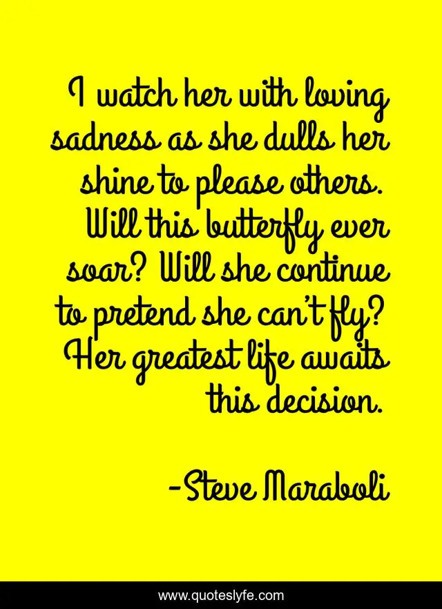 This page presents the quote "I watch her with loving sadness as she dulls her shine to please others. Will this butterfly ever soar? Will she continue to pretend she can’t fly? Her greatest life awaits this decision.". Author of this quote is Steve Maraboli. This quote is about butterfly, decision, love, affection,.