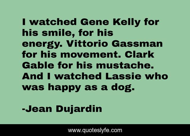 This page presents the quote "I watched Gene Kelly for his smile, for his energy. Vittorio Gassman for his movement. Clark Gable for his mustache. And I watched Lassie who was happy as a dog.". Author of this quote is Jean Dujardin. This quote is about energy, dog, happy,.