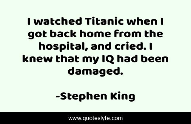 This page presents the quote "I watched Titanic when I got back home from the hospital, and cried. I knew that my IQ had been damaged.". Author of this quote is Stephen King. This quote is about iq, hospital, back,.