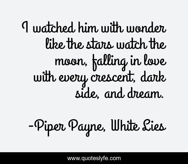 This page presents the quote "I watched him with wonder like the stars watch the moon, falling in love with every crescent, dark side, and dream.". Author of this quote is Piper Payne, White Lies. This quote is about relationships, angsty-love, falling-in-love, love, relationship, moon, romance, romance-book, stars,.