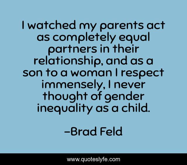 This page presents the quote "I watched my parents act as completely equal partners in their relationship, and as a son to a woman I respect immensely, I never thought of gender inequality as a child.". Author of this quote is Brad Feld. This quote is about parents, relationship, son,.