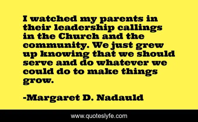 This page presents the quote "I watched my parents in their leadership callings in the Church and the community. We just grew up knowing that we should serve and do whatever we could do to make things grow.". Author of this quote is Margaret D. Nadauld. This quote is about parents, grow, community,.